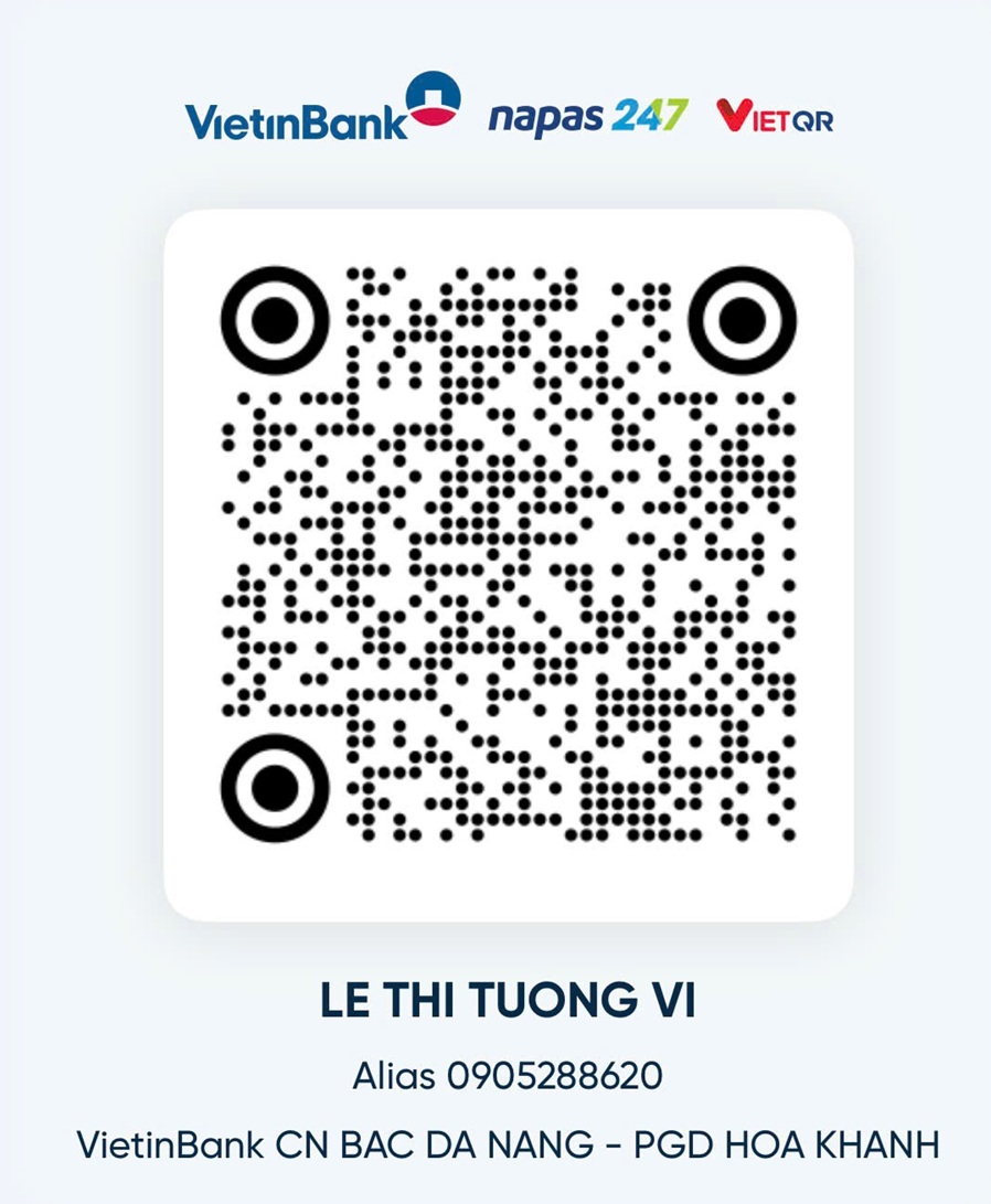 hoặc chuyển khoản đến số TK: 109881749920 – Ngân hàng Vietinbank (Le Thi Tuong Vi), nội dung chuyển khoản: HỌ VÀ TÊN, NGÀY THÁNG NĂM SINH, HẠNG KHÓA HỌC